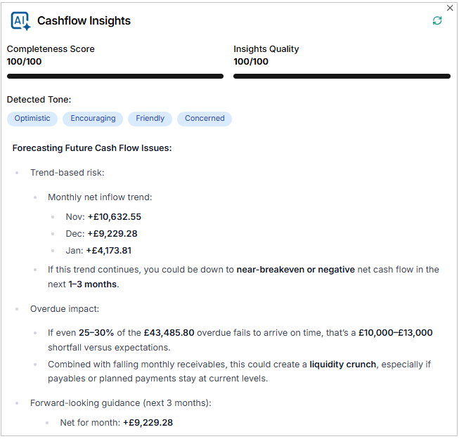 AI analyses real transaction data to identify patterns, predict future cash gaps, and highlight potential risks early. This allows businesses to take action before problems arise, rather than reacting when cash shortages already exist.